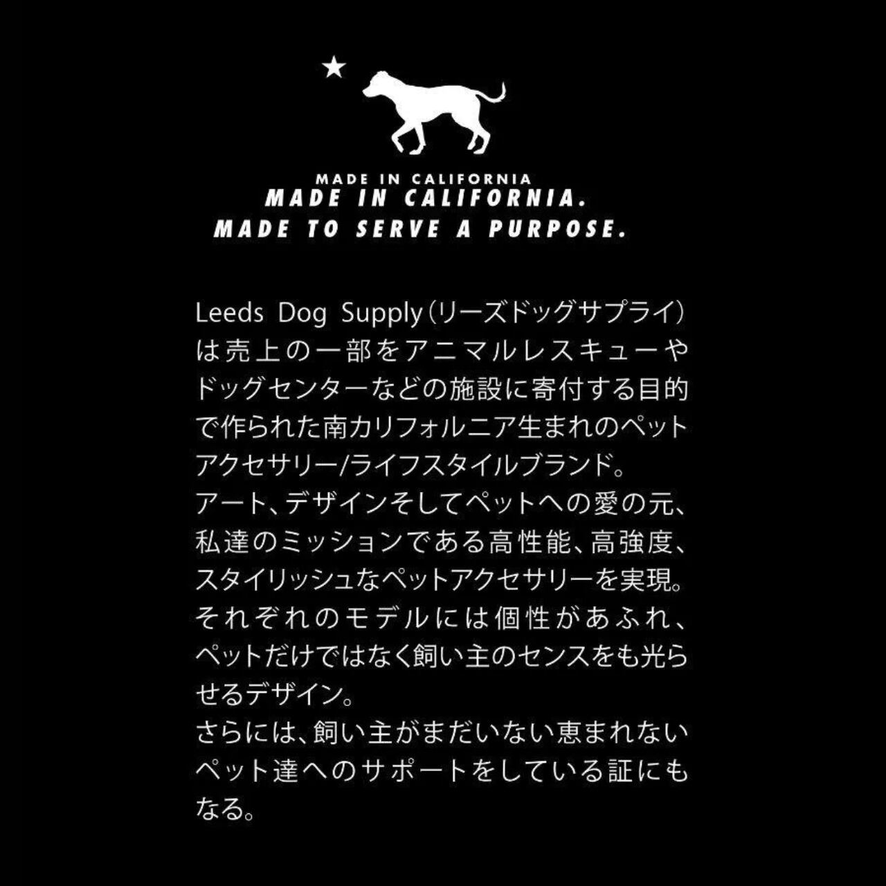 売上の一部をアニマルレスキューやドッグセンターなどの施設に寄付する目的で作られた南カリフォルニア生まれのペットアクセサリー/ライフスタイルブランド。
